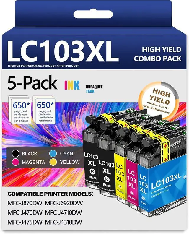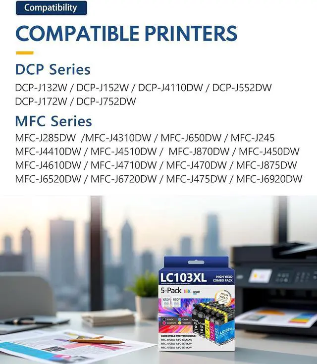 Wide Compatibility: LC103XL ink cartridges Compatible with Brother DCP-J132W DCP-J152W DCP-J172W DCP-J4110DW DCP-J552DW DCP-J752DW MFC-J245 MFC-J285DW MFC-J4310DW MFC-J4410DW MFC-J450DW MFC-J4510DW MFC-J4610DW MFC-J470DW MFC-J4710DW MFC-J475DW MFC-J650DW MFC-J6520DW MFC-J6720DW MFC-J6920DW MFC-J870DW MFC-J875DW Printer