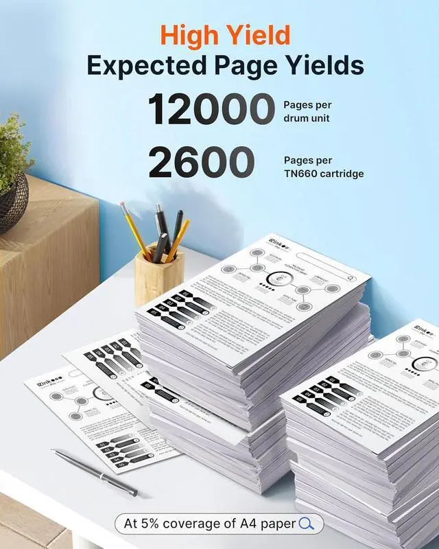 High Page Yield: 2,600 Pages Per TN660 Toner Cartridge and 12,000 Pages Per DR630 Drum Unit (at 5% coverage).
