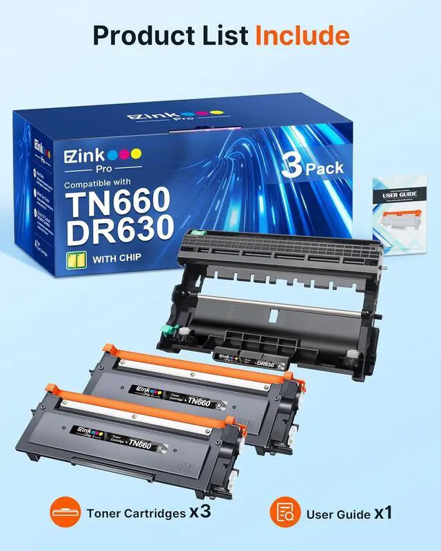 Package Contents: 2 x TN660 Toner Cartridge, 1 x DR630 Drum Unit (Total 3 Pack). Get the compatible TN660 toner cartridge and DR630 drum unit together in one order no need to search, compare, or purchase separately. A true hasslefree solution.