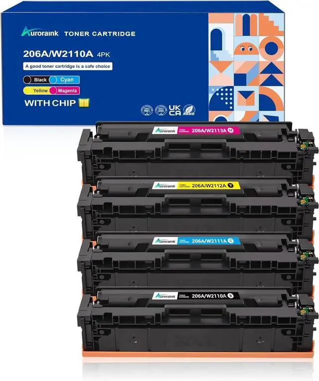Package Contents: 4 Pack 206A toner cartridges reeplacement for HP 206A/206X toner cartridges (Includes: 1 x 206A W2110A black, 1 x 206A W2111A cyan, 1 x 206A W2112A yellow, and 1 x 206A W2113A magenta toner cartridge)