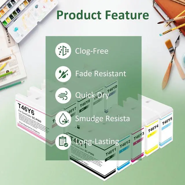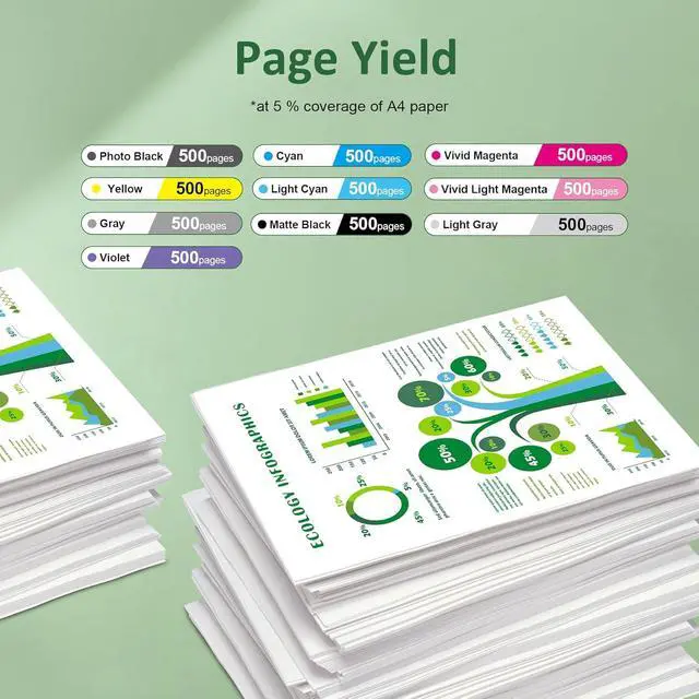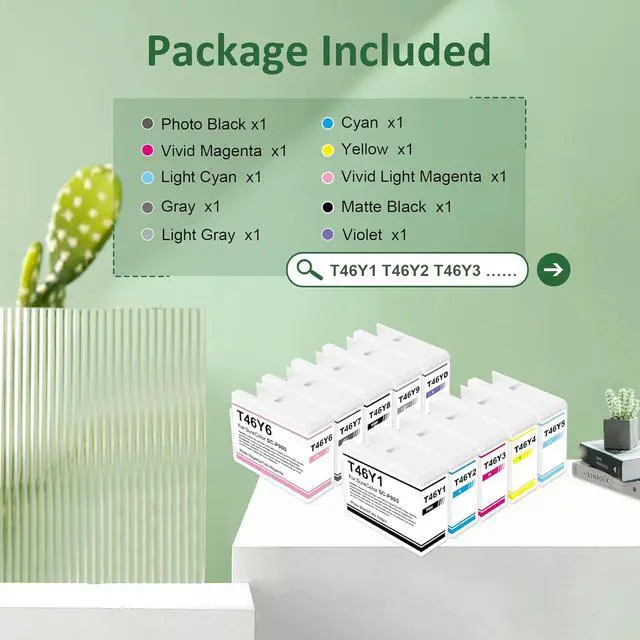 Product Details: 10-Pack Standard-yield Color Ink Cartridges with premium ink based includes 1 Violet (T46YD00), 1 Photo Black (T46Y100), 1 Cyan (T46Y200), 1 Vivid Magenta (T46Y300), 1 Yellow (T46Y400), 1 Light Cyan (T46Y500), 1 Vivid Light Magenta (T46Y600), 1 Gray (T46Y700), 1 Matte Black (T46Y800), 1 Light Gray (T46Y900).
