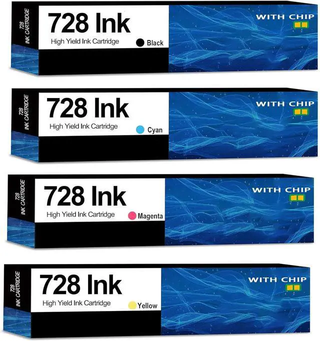 Pakage contents: 4 Pack Black Magenta Yellow Cyan 728 Ink Cartridges (F9J68A F9K17A F9K16A F9K15A)