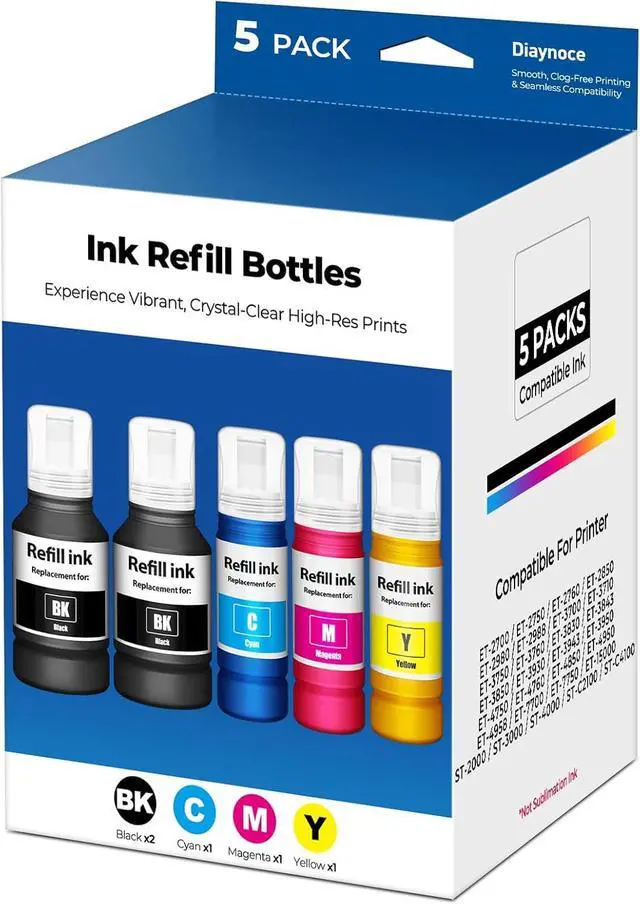 Compatible Printers: for ET-2850 ink refill bottles, ET-3850 ink refill bottles, ET-4850 ink refill bottles, ET-15000 ink refill bottles, ET-2700 ink refill bottles, ET-2750 ink refill bottles, ET-2760 ink refill bottles, ET-2980 ink refill bottles, ET-2988 ink refill bottles, ET-3700 ink refill bottles, ET-3710 ink refill bottles, ET-3750 ink refill bottles