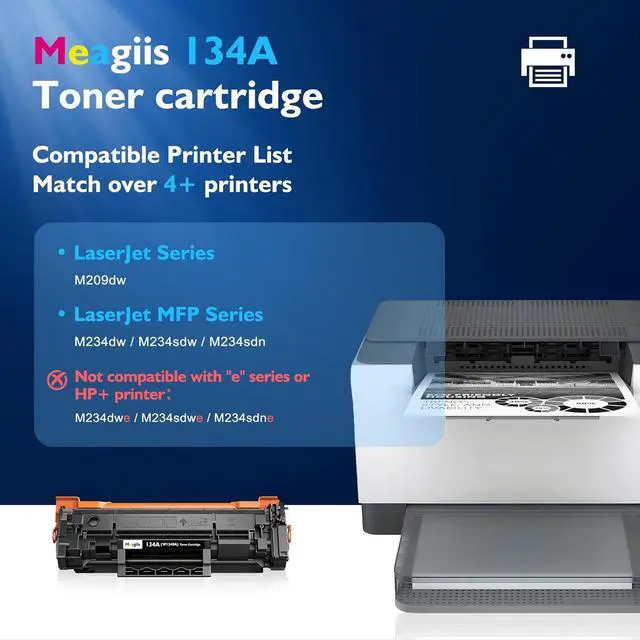Printer Compatibility: 134A Toner Cartridge fully compatible with HP LaserJet M209dw MFP M234dw M234sdw Series Printer. (NOT Compatible for printers suffix with letter "e" such as: Pro MFP M234dwe M234sdwe M234sdne M209dwe Series Printer)