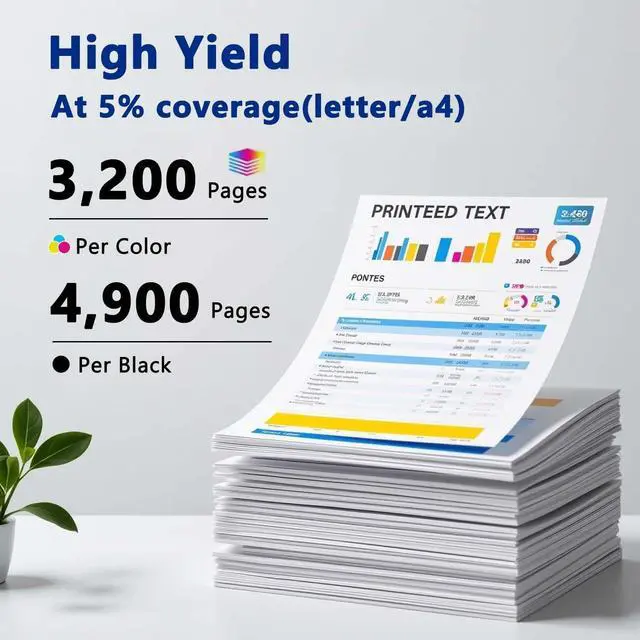 High Page Yiled: 4,900 pages per Black cartridge and 3,200 pages per Cyan Yellow Magenta Cartridge at 5% coverage (Letter/A4).