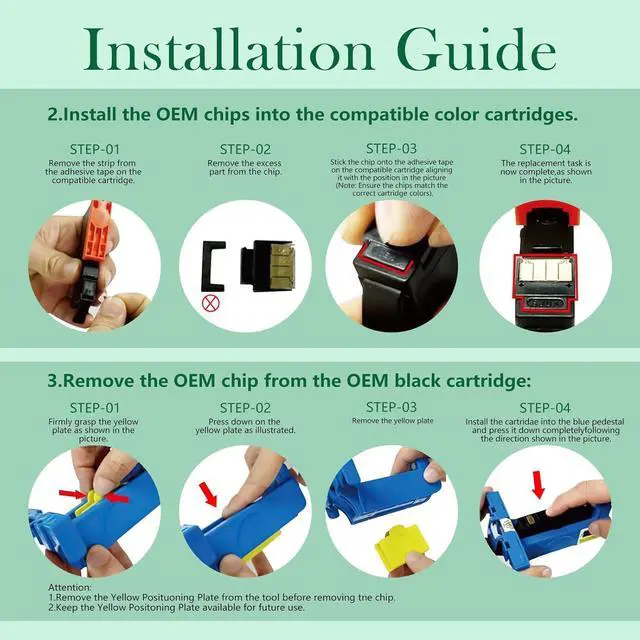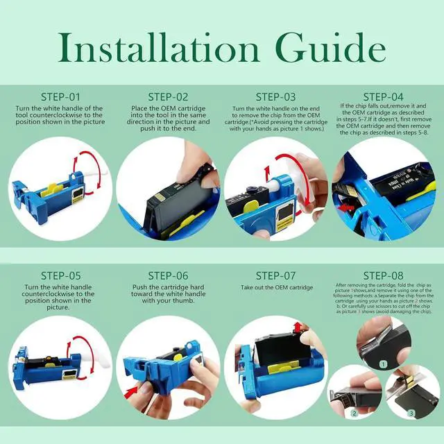 Chip Replacement Guide: You need to remove the original chips on ink cartridges through our tool. Peel off the tape of the new compatible cartridge and Stick the chip onto the tape