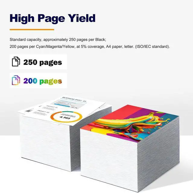 High Print Yields - - Standard capacity, approximately 250 pages per Black; 200 pages per Cyan/Magenta/Yellow, at 5% coverage, A4 paper, letter. (ISO/IEC standard).