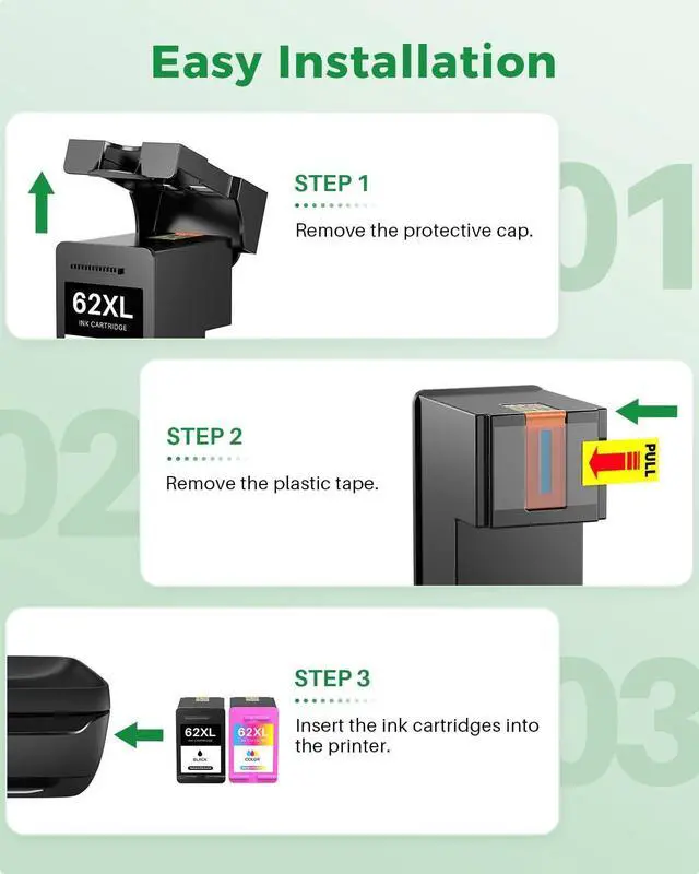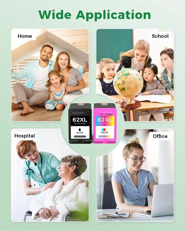 Package Content: (Total 2 pack 62 XL ink cartridges combo pack) 62 XL Black, 62 XL Tri-Color