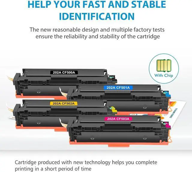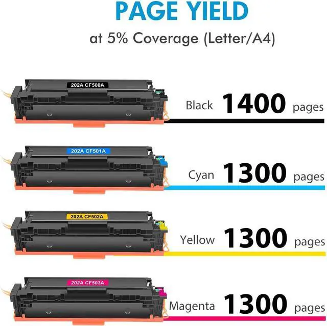 High Page Yield: Up to 1,400 Pages per 202A CF500A Black Toner Cartridges & 1,300 Pages per CF501A CF502A CF503A Cyan Yellow Magenta Toner Cartridges (Letter/A4, at 5% Coverage)