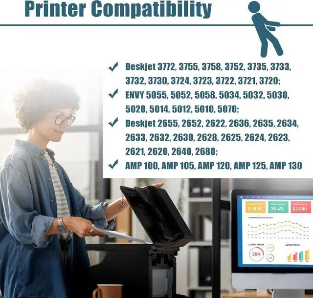 Compatible Printers: Compatible for HP Deskjet 3772, 3755, 3758, 3752, 3735, 3733, 3732, 3730, 3724, 3723, 3722, 3721, 3720; ENVY 5055, 5052, 5058, 5034, 5032, 5030, 5020, 5014, 5012, 5010, 5070; Deskjet 2655, 2652, 2622, 2636, 2635, 2634, 2633, 2632, 2630, 2628, 2625, 2624, 2623, 2621, 2620, 2640, 2680; AMP 100, AMP 105, AMP 120, AMP 125, AMP 130.