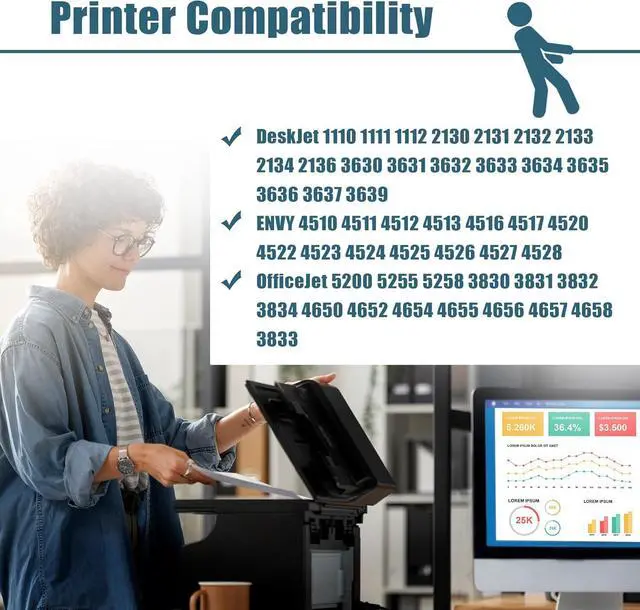 Compatible Printers: Compatible for HP DeskJet 1110 1111 1112 2130 2131 2132 2133 2134 2136 3630 3631 3632 3633 3634 3635 3636 3637 3639 ENVY 4510 4511 4512 4513 4516 4517 4520 4522 4523 4524 4525 4526 4527 4528 OfficeJet 5200 5255 5258 3830 3831 3832 3834 4650 4652 4654 4655 4656 4657 4658 3833.