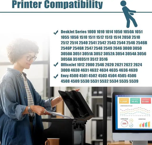 Compatible Printers: Compatible for HP DeskJet Series 1000 1010 1014 1050 1050A 1051 1055 1056 1510 1511 1512 1513 1514 2050 2510 2512 2514 2540 2541 2542 2543 2544 2546 2546B 2546P 2546R 2547 2548 2549 2646 3000 3050 3050A 3051 3051A 3052 3052A 3054 3054A 3056 3056A 35103511 3512 3516 OfficeJet 1012 2000 2546 2620 2621 2622 2624 3000 4630 4631 4632 4634 4635 4636 4639 Envy 4500 4501 4502 4503 4504 4505 4506 4508 4509 5530 5531 5532 5534 5535 5539.