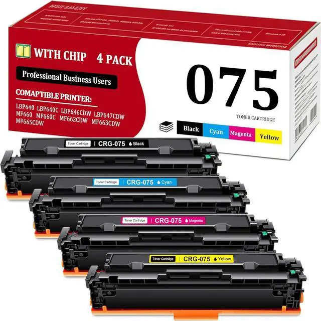 Contents: 1 brand new 075 black toner cartridge, 1 brand new 075 cyan toner cartridge, 1 brand new 075 magenta toner cartridge, 1 brand new 075 yellow toner cartridge