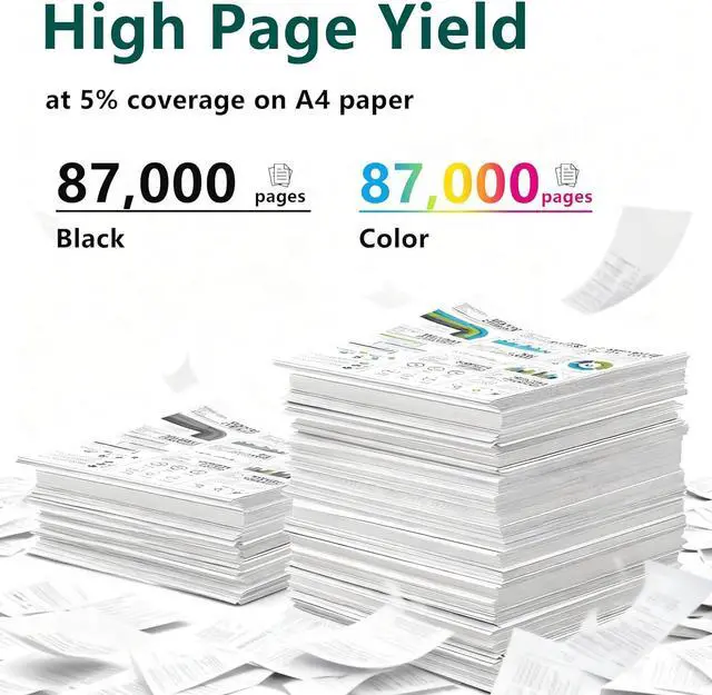 High throughput: Up to 87,000 pages in black and white and up to 87,000 pages in color (based on 5% A4 coverage), ideal for high-volume home/office users. Reduced replacement frequency and long-term costs make it an economical choice for original parts.