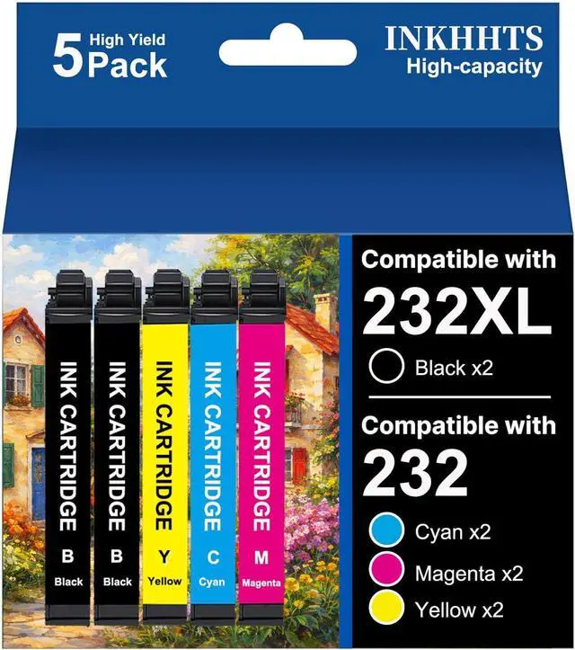 Package Contents: Remanufactured for Epson 232XL ink cartridges combo pack includes: 2× Black 232XL ink cartridge, 1× Cyan 232 ink cartridge, 1× Magenta 232 ink cartridge, and 1× Yellow 232 ink cartridge