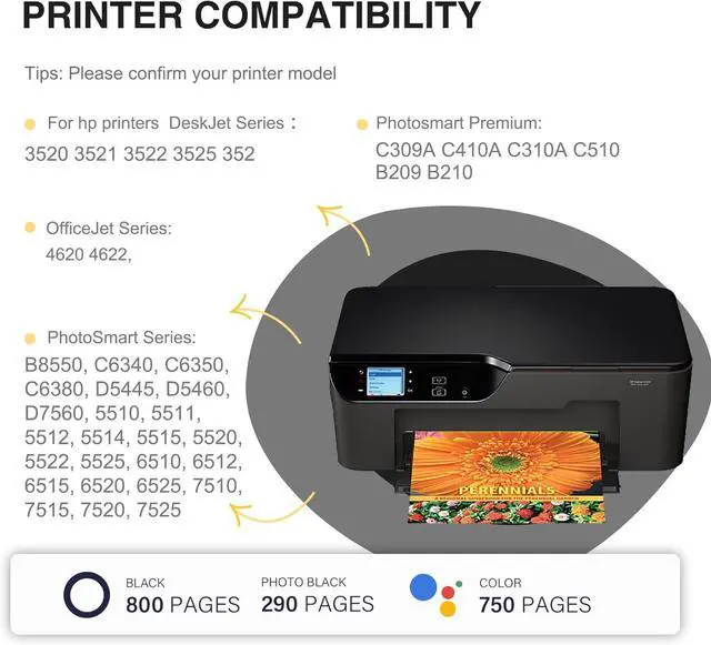 Works with HP Compatible Printers: DeskJet Series: 3520, 3521, 3522, 3525, 3526; OfficeJet Series: 4620 4622; PhotoSmart Series: B8550, C6340, C6350, C6380, D5445, D5460, D7560, 5510, 5511, 5512, 5514, 5515, 5520,5522, 5525, 6510, 6512,6515, 6520, 6525, 7510,7515, 7520, 7525; Photosmart Premium: C309A C410A C310A C510 B209 B210