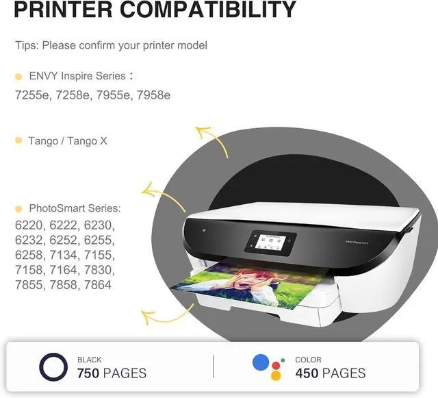 Works with HP Compatible Printers: ENVY Inspire Series : 7255e, 7258e, 7955e, 7958e; PhotoSmart Series: 6220, 6222, 6230,6232, 6252, 6255,6258, 7134, 7155,7158, 7164, 7830,7855, 7858, 7864; Tango, Tango X