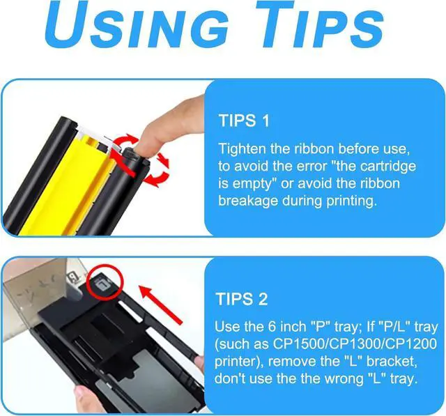 Warm Tips1. Use the 6 inch "P" tray; If "P/L" tray (such as CP1500/CP1300/CP1200 printer), remove the "L" bracket, don't use the the wrong "L" tray. 2. Tighten the ribbon before use, to avoid the error "the cartridge is empty" or avoid the ribbon breakage during printing. 3. Do not touch the bright side of photo paper. 4. Please check if the paper size in the layout software matches the one in the paper tray.