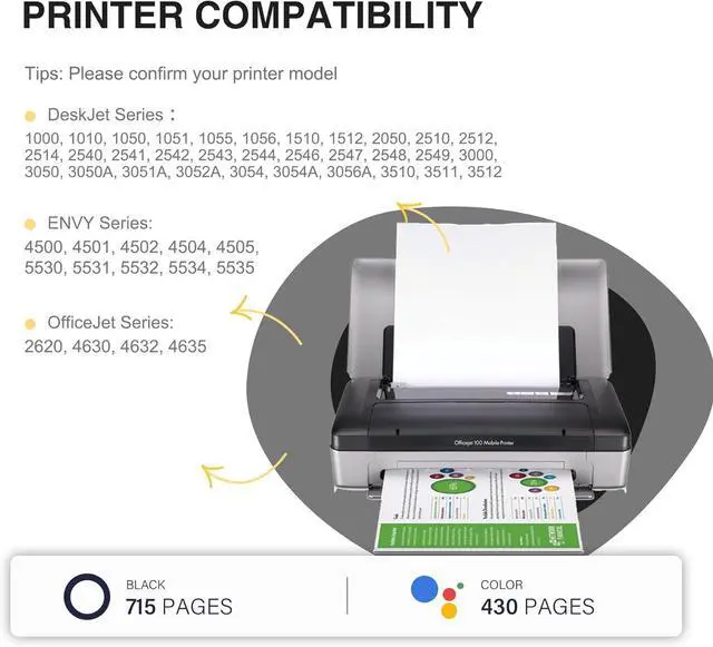 Works with HP Compatible Printers: DeskJet Series : 1000, 1010, 1050, 1051, 1055, 1056, 1510, 1512, 2050, 2510, 2512,2514, 2540, 2541, 2542, 2543, 2544, 2546, 2547, 2548, 2549, 3000, 3050, 3050A, 3051A, 3052A, 3054, 3054A, 3056A, 3510, 3511, 3512; ENVY Series: 4500, 4501, 4502, 4504, 4505,5530, 5531, 5532, 5534, 5535; OfficeJet Series: 2620, 4630, 4632, 4635