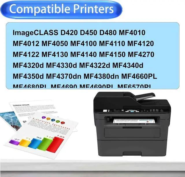 CompatibilityCRG 104 toner cartridges Compatible For Canon ImageCLASS D420 D450 D480 MF4010 MF4012 MF4050 MF4100 MF4110 MF4120 MF4122 MF4130 MF4140 MF4150 MF4270 MF4320d MF4330d MF4322d MF4340d MF4350d MF4370dn MF4380dn MF4660PL MF4680PL MF4690 MF4690PL MF6570PL Printer