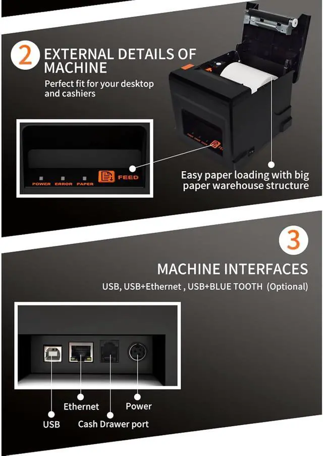Cost SavingsThis receipt printer uses thermal printing technology and requires no ribbon/ink. The printing speed of 220mm/s provides you with an efficient working environment, and fast printing allows your customers to escape the crowds.