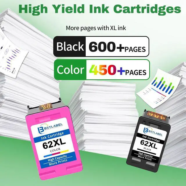 High Yield : BSTLABEL 62XL Ink Cartridge Replacement for HP 62 Ink Cartridge Combo Pack Which Page Yield Is Up to 600 pages per for hp 62 black ink cartridge at 5% coverage (A4 paper size).