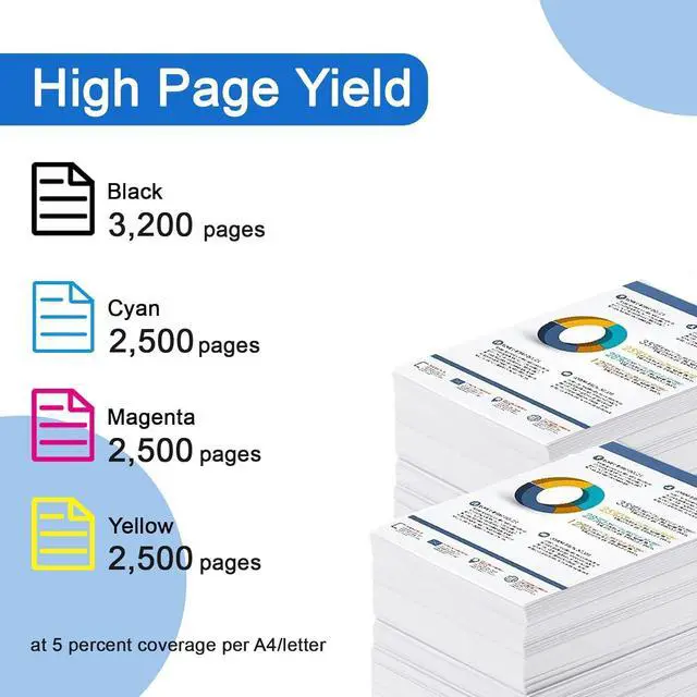 Paper Yield222X black can print up to 3200 pages, 222X colors each can each print up to 2500 pages, these page yields are at 5% coverage of A4 paper