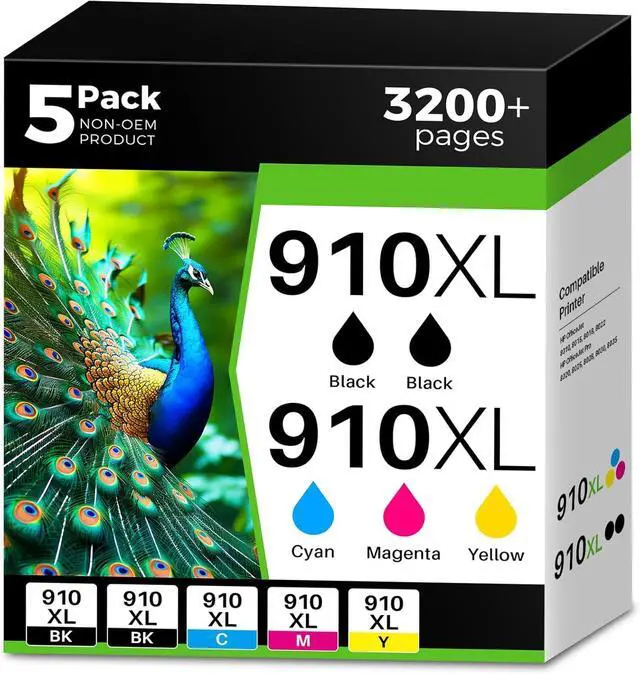 Package Included: 5 Combo Pack high yield 910xl ink cartridges for HP printers [1 user guide, 2 black 910xl ink, 1 Cyan 910xl ink, 1 Magenta 910xl ink, 1 Yellow 910xl ink]