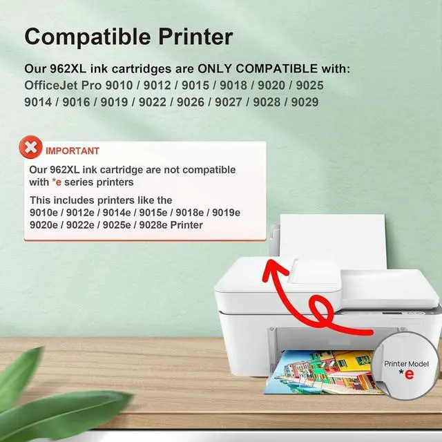COMPATIBLE PRINTERS: This is not an OEM product. VOREDO 962xl ink cartridges combo pack work for HP OfficeJet Pro 9010 9012 9015 9018 9020 9025 9014 9016 9019 9022 9026 9027 9028 9029 Printer (Please also check side pics).