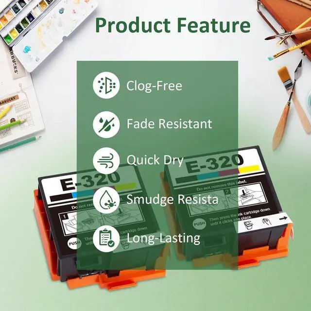 Product Details: 2-Pack Standard-yield Black& Color Ink Cartridges with premium ink based includes 2 packs of 4-color t320 ink cartridge.