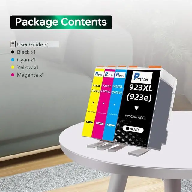 The box contains:1 New Extra Capacity Cartridge 923 pack of 4 ink cartridges:923XL Cyan,Magenta,Yellow and Black ink cartridges for hp printer,a user guide