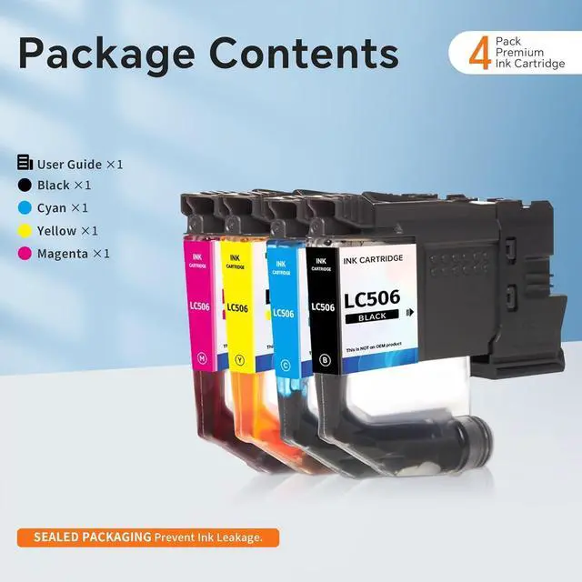 The box contains:1 New Extra Capacity Cartridge LC506 pack of 4 ink cartridges:LC506 Cyan,Magenta,Yellow and Black ink cartridges,a user guide.