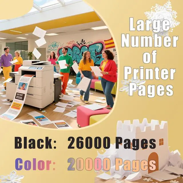 26000 pages of high print volume, economical and durable : A black single toner cartridge can print about 26000 pages,A color single toner cartridge can print about 20000 pages (5% coverage), reducing the cost of frequent replacement, suitable for high-load printing needs