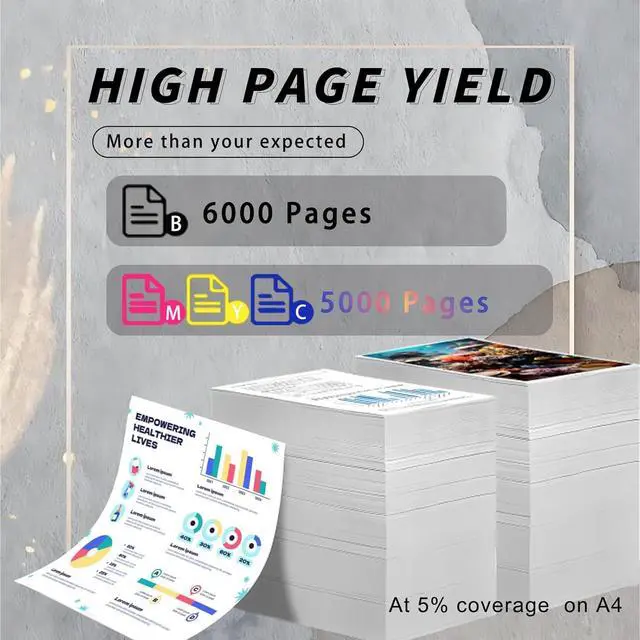 Printing page number description: This Toner Cartridges has excellent printing and can provide you with long-term stable printing support. Each black Toner Cartridges can print approximately 4000 pages, and each color Toner Cartridges can print approximately 3500 pages (A4 paper, 5% page coverage)