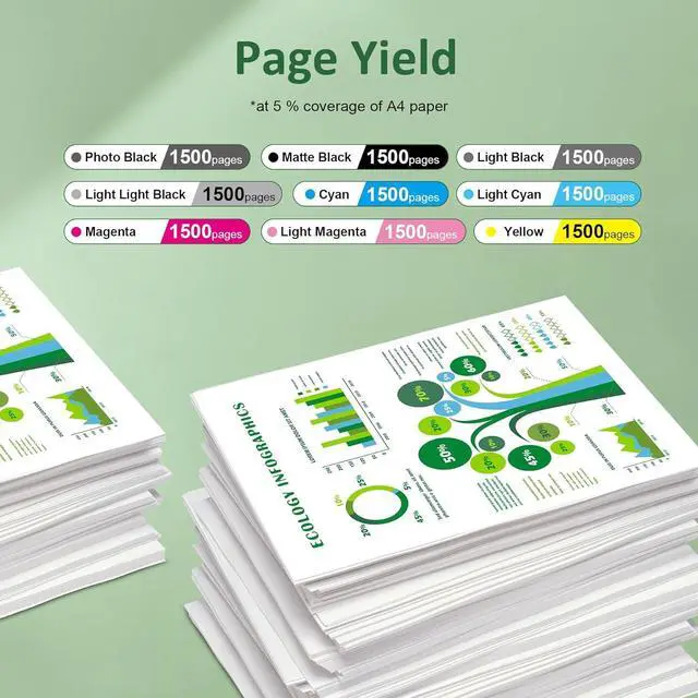 Product Details: 9-Pack Standard-yield Color Ink Cartridges with premium ink based includes 1 Photo Black, 1 Light Black, 1 Light Light Black, 1 Matte Black, 1 Cyan, 1 Magenta, 1 Yellow, 1 Light Cyan, 1 Light Magenta cartridge.