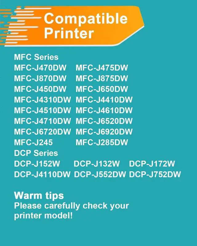 Compatible Printers: MFC-J245, MFC-J285DW, MFC-J450DW, MFC-J470DW, MFC-J475DW, MFC-J650DW, MFC-J870DW, MFC-J875DW, MFC-J4310DW, MFC-J4410DW, MFC-J4510DW MFC-J4610DW, MFC-J4710DW, MFC-J6520DW, MFC-J6720DW, MFC-J6920DW; DCP-J132W,DCP-J152W, DCP-J172W, DCP-J552DW, DCP-J752DW, DCP-J4110DW Printer