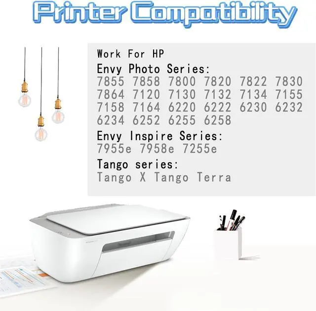 Compatible with: Compatible for HP Envy Photo series:7855 7858 7800 7820 7822 7830 7864 7120 7130 7132 7134 7155 7158 7164 6220 6222 6230 6232 6234 6252 6255 6258;Envy Inspire series: Envy Inspire 7955e 7958e 7255e;Tango series: Tango Tango X Tango Terra
