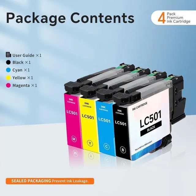 Package Content: 1 x Black LC501BK Ink Cartridge, 1 x Cyan LC501C Ink Cartridge, 1 x Magenta LC501M Ink Cartridge, 1 x Yellow LC501Y Ink Cartridge, 1 x User Guide