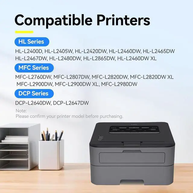 Compatible Printers: HL Series: HL-L2400D, HL-L2405W, HL-L2420DW, HL-L2460DW, HL-L2465DW, HL-L2467DW, HL-L2480DW, HL-L2865DW, HL-L2460DW XL; MFC Series: MFC-L2760DW, MFC-L2807DW, MFC-L2820DW, MFC-L2820DW XL, MFC-L2900DW, MFC-L2900DW XL, MFC-L2980DW; DCP Series: DCP-L2640DW, DCP-L2647DW Printer