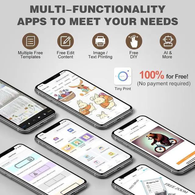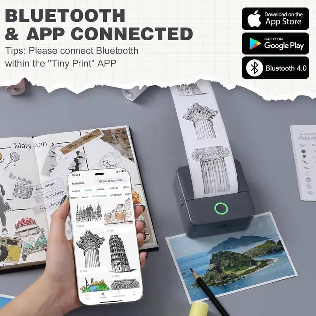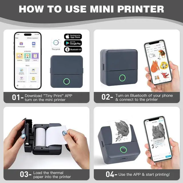 Multifunctional Mini Printer: Using the mini sticker printer, you can print black and white photos, pictures, study notes, to-do lists, shopping lists, etc. as well as customize bookmarks, labels, magazines and greeting cards, the APP contains a variety of templates and is compatible with Android 4.0 and IOS9.0 or higher