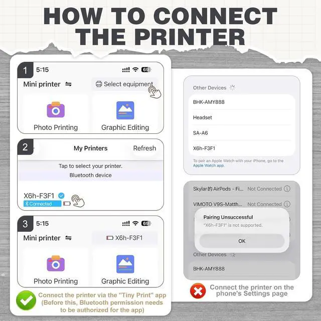 Bluetooth One-Click Printing APP: The label printer uses the "Tiny Print" app Bluetooth connection, no other complicated processes are required, just follow the connection instructions to quickly connect to the smartphone, the app is equipped with free zoom and drag options, OCR functions and stickers Lots of templates, editing options, and text