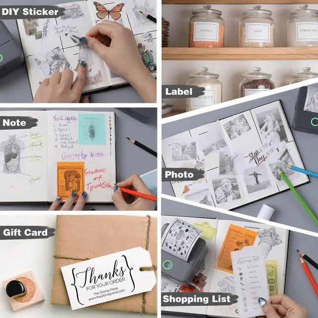 Customized Thermal Inkless Printer: The Inkless sticker printer uses thermal printing technology and is equipped with 5 rolls of adhesive printing paper & 5 rolls thermal printing paper , ink-free printing, the 2-inch wide thermal paper can be freely cut to length or shape, as well as labels size to create your own sticker ideas anytime, anywhere (Black and White only)