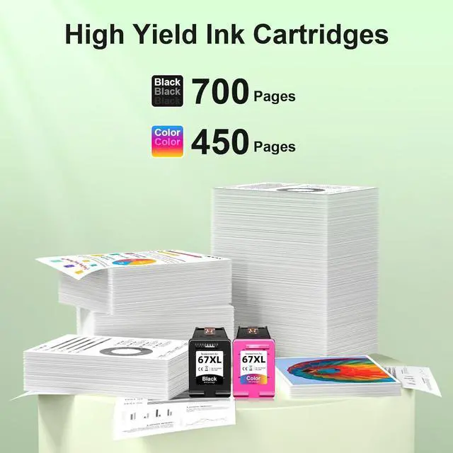 High Yield 67 XL Ink Cartridge for HP Printers: 700 pages compatible for hp 67 black ink cartridge and 450 pages compatible for hp 67 color ink cartridgeAt 5% Standard Coverage), reducing the hassle of frequent ink cartridge changes and especially suitable for users with high volume printing.