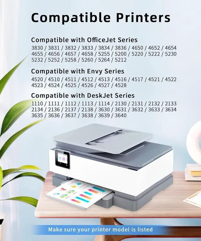High Printer Compatibility:Compatible with HP OfficeJet 3830, 3831, 3832, 3833, 3834, 3836, 4650, 4652, 4654, 4655, 4656, 4657, 4658, 5255, 5200, 5220, 5222, 5230, 5232, 5252, 5258, 5260, 5264, 5212 Compatible with HP Envy 4520, 4510, 4511, 4512, 4513, 4516, 4517, 4521, 4522, 4523, 4524, 4525, 4526, 4527, 4528 Compatible with HP DeskJet 1110, 1111, 1112, 1113, 1114, 2130, 2131, 2132, 2133, 2134, 2136, 2137, 2138, 3630, 3631, 3632, 3633, 3634, 3635, 3636, 3637, 3638, 3639, 3640