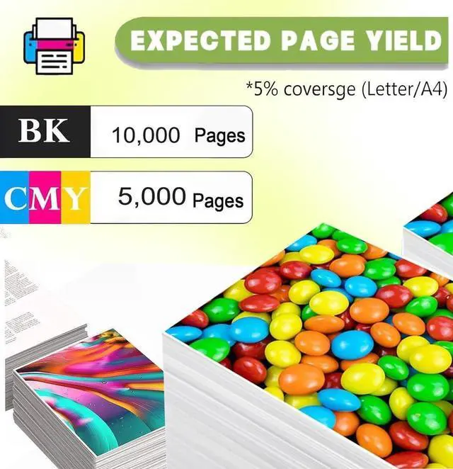 Print Page Yield: K: 10,000 pages CMY: 5,000 pages (5% coverage on A4 paper) High-capacity design supports extended printing, significantly reducing replacement frequency and boosting productivity. Ideal for offices or home users with substantial daily printing demands.