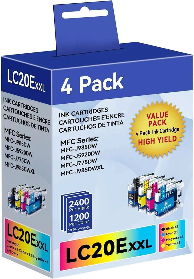 Packing ListLC20E XXL Ink Cartridges for Brother Printer contains 1 x Black lc20e xxl+1 x Cyan lc20e xxl+1 x Magenta lc20e xxl+1 x Yellow lc20e xxl (4 cartridges in total)