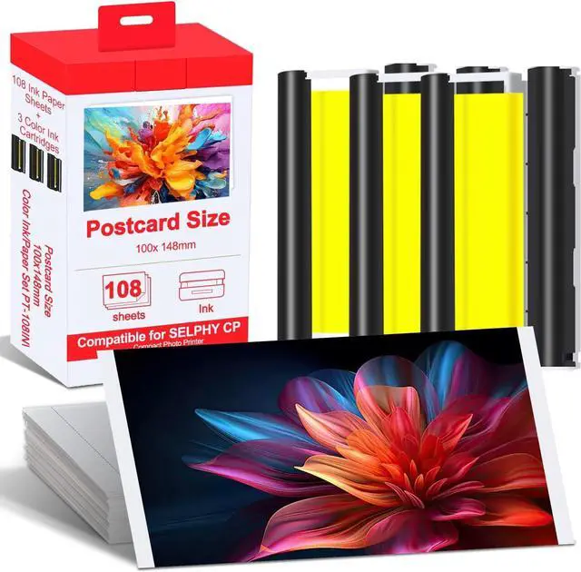 Package Contents: Canon Selphy Ink Cartridge and Photo Paper Bundle, containing 3 Color Ink Cartridges & 108 Sheets 4x6 Photo Paper Glossy (4 x 6", 100 x 148mm)
