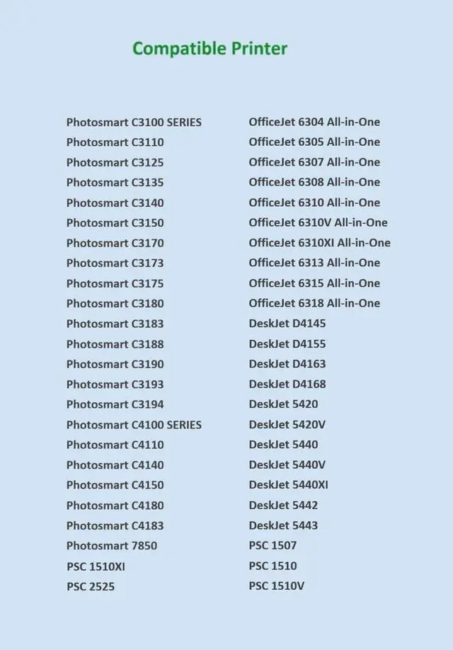 Compatible Printers: HP PSC 1507, PSC 1510, PSC 1510V, PSC 1510XI, PSC 2525 HP Photosmart C3100 Series: Photosmart C3110, Photosmart C3125, Photosmart C3135, Photosmart C3140, Photosmart C3150, Photosmart C3170, Photosmart C3173, Photosmart C3175, Photosmart C3180, Photosmart C3183, Photosmart C3188, Photosmart C3190, Photosmart C3193, Photosmart C3194 Photosmart C4100 Series: Photosmart C4110, Photosmart C4140, Photosmart C4150, Photosmart C4180, Photosmart C4183, Photosmart 7850