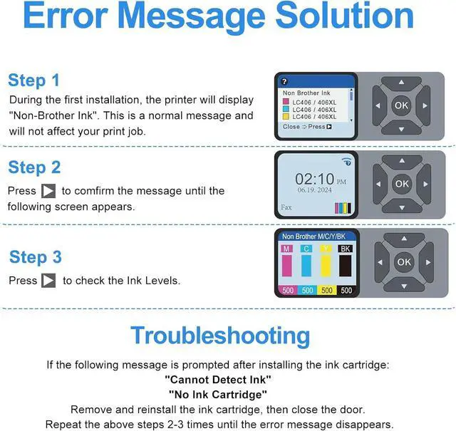 Warm Tip: Don't remove or touch the CHIP; If prompted for this Printer error "cartridge not recognized", "The printer does not have enough ink", Please reinstall the cartridge to turn it off and on once until it is recognized; When the printer prompts "non-original", please click OK or Next to continue