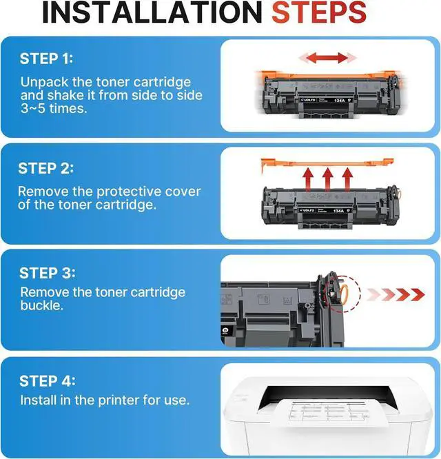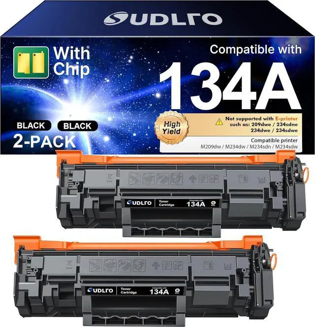 What's in the Box: 2 × 134A Black Toner Cartridge (with Chip), 1 x User Instruction Card